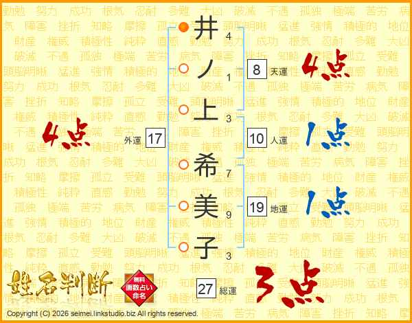 井(4画)ノ(1画)上(3画) 希(7画)美(9画)子(3画)