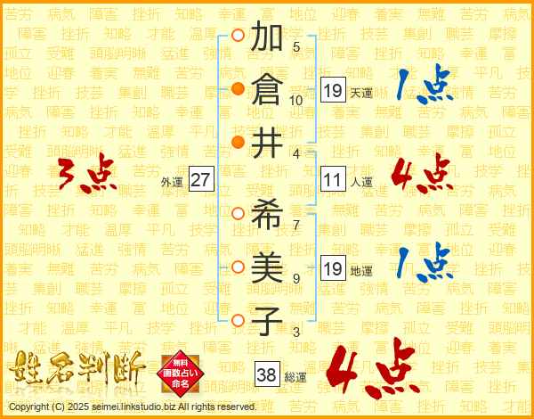 加(5画)倉(10画)井(4画) 希(7画)美(9画)子(3画)