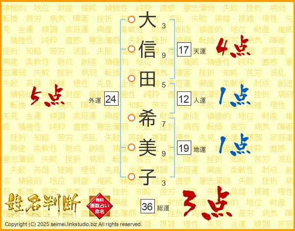 大(3画)信(9画)田(5画) 希(7画)美(9画)子(3画)