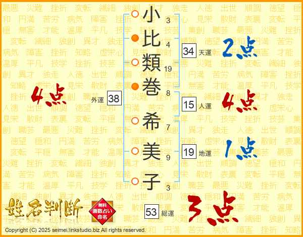 小(3画)比(4画)類(19画)巻(8画) 希(7画)美(9画)子(3画)