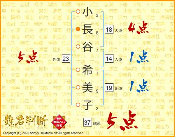 小(3画)長(8画)谷(7画) 希(7画)美(9画)子(3画)
