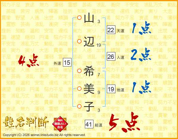 山(3画)辺(19画) 希(7画)美(9画)子(3画)