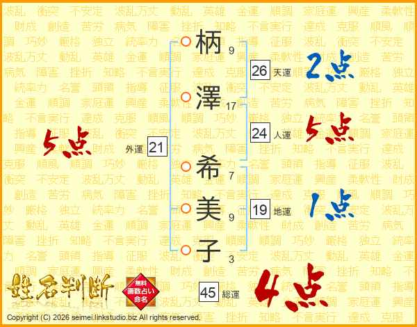 柄(9画)澤(17画) 希(7画)美(9画)子(3画)