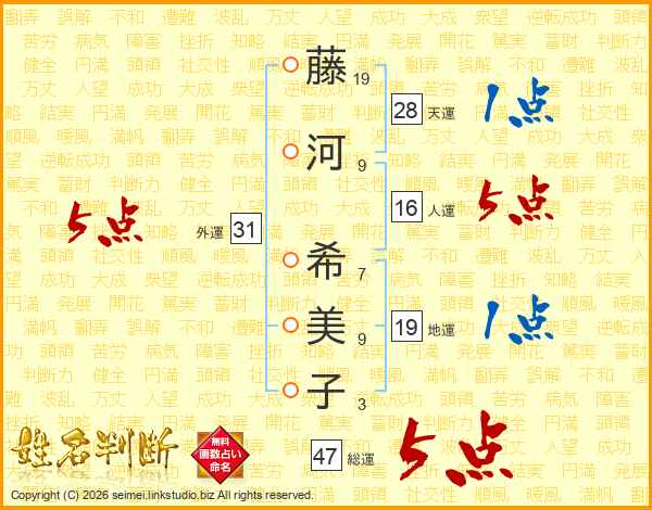 藤(19画)河(9画) 希(7画)美(9画)子(3画)