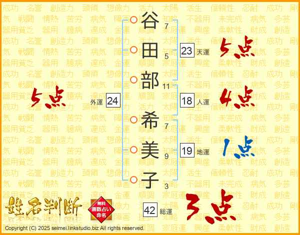 谷(7画)田(5画)部(11画) 希(7画)美(9画)子(3画)