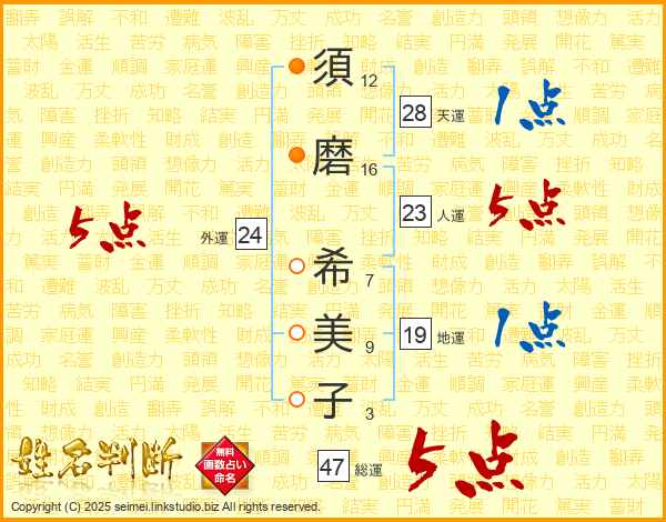 須(12画)磨(16画) 希(7画)美(9画)子(3画)