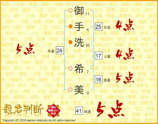 御(11画)手(4画)洗(10画) 希(7画)美(9画)