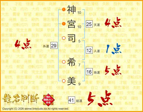 神(10画)宮(10画)司(5画) 希(7画)美(9画)