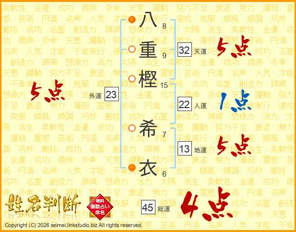 八(8画)重(9画)樫(15画) 希(7画)衣(6画)