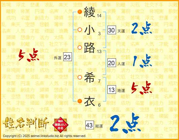 綾(14画)小(3画)路(13画) 希(7画)衣(6画)