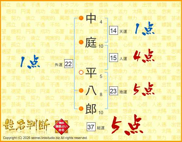 中(4画)庭(10画) 平(5画)八(8画)郎(10画)
