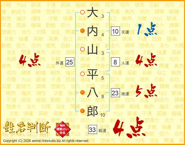 大(3画)内(4画)山(3画) 平(5画)八(8画)郎(10画)