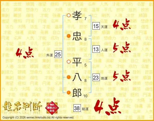 孝(7画)忠(8画) 平(5画)八(8画)郎(10画)