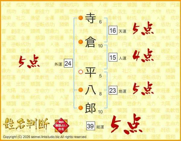 寺(6画)倉(10画) 平(5画)八(8画)郎(10画)