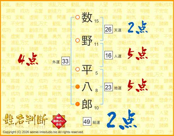 数(15画)野(11画) 平(5画)八(8画)郎(10画)