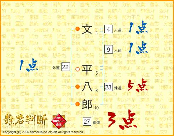 生活面を象徴する運勢です。外部から受ける影響力を表し、結婚運、家庭運や職場、環境への順応性を表します。総運から人運を引いた画数。姓や名が1文字の場合を除く。