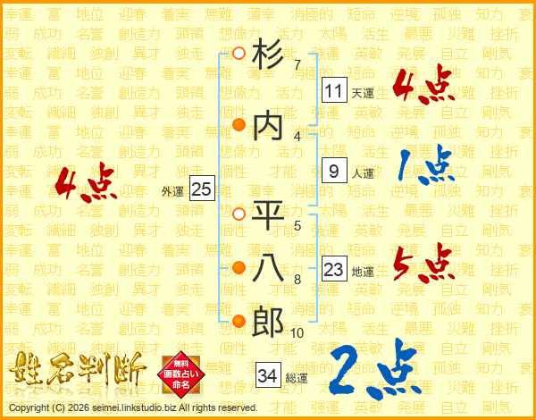 杉(7画)内(4画) 平(5画)八(8画)郎(10画)