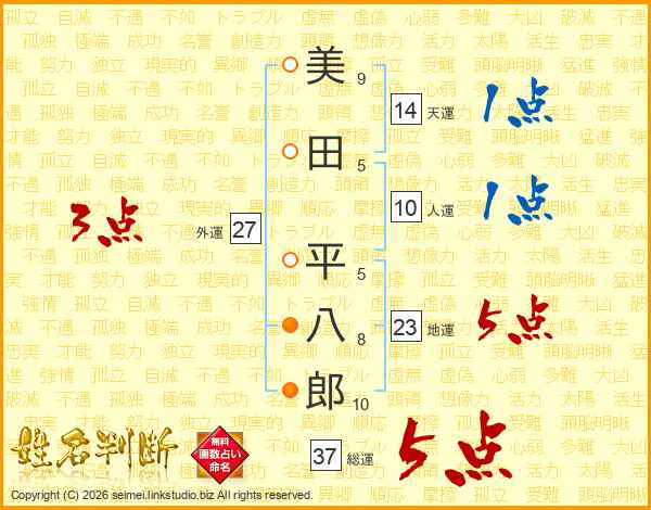 美(9画)田(5画) 平(5画)八(8画)郎(10画)