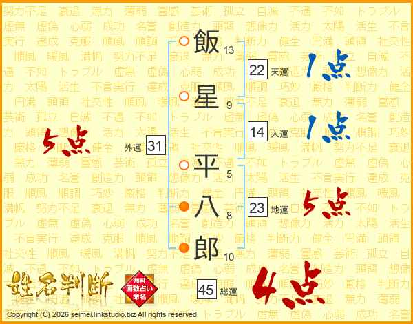 飯(13画)星(9画) 平(5画)八(8画)郎(10画)