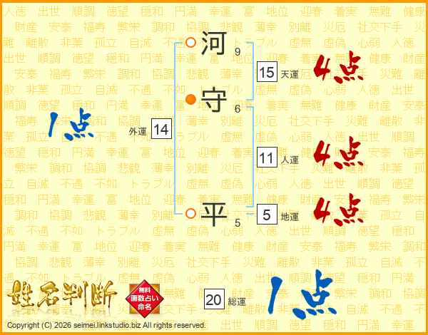 生活面を象徴する運勢です。外部から受ける影響力を表し、結婚運、家庭運や職場、環境への順応性を表します。総運から人運を引いた画数。姓や名が1文字の場合を除く。