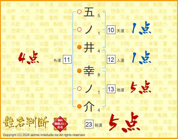 五(5画)ノ(1画)井(4画) 幸(8画)ノ(1画)介(4画)