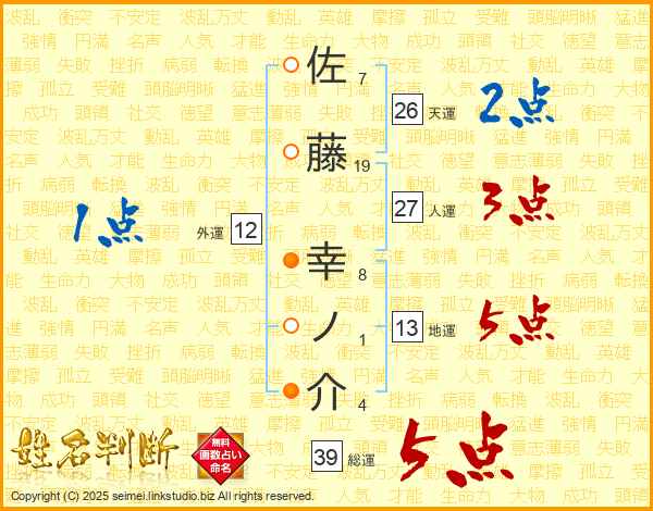 佐(7画)藤(19画) 幸(8画)ノ(1画)介(4画)