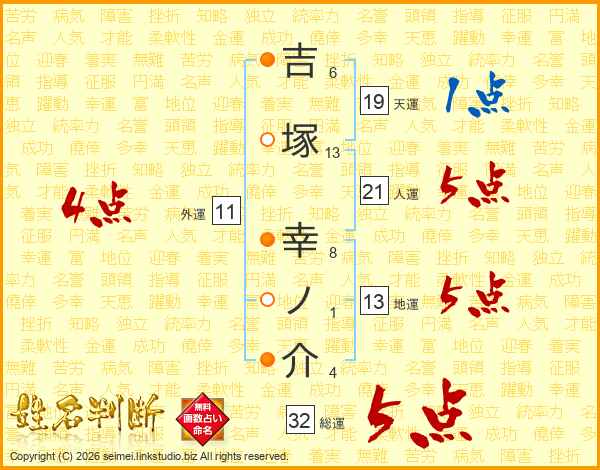 吉(6画)塚(13画) 幸(8画)ノ(1画)介(4画)