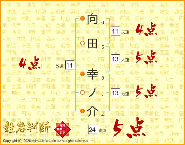 向(6画)田(5画) 幸(8画)ノ(1画)介(4画)