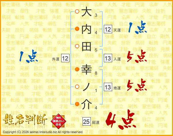 大(3画)内(4画)田(5画) 幸(8画)ノ(1画)介(4画)