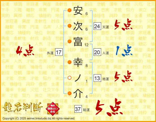 安(6画)次(6画)富(12画) 幸(8画)ノ(1画)介(4画)
