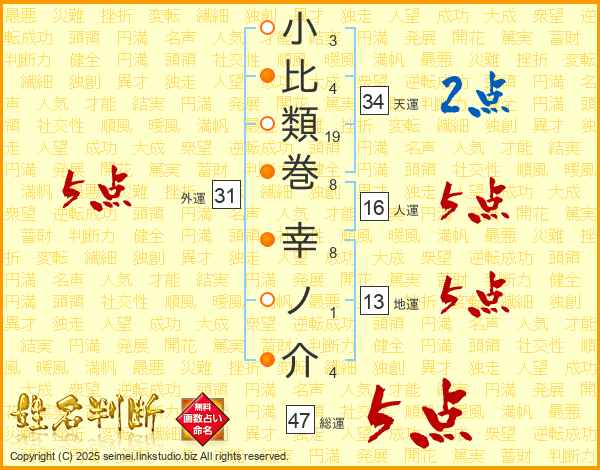小(3画)比(4画)類(19画)巻(8画) 幸(8画)ノ(1画)介(4画)