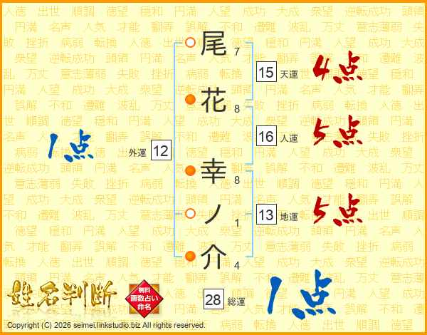 尾(7画)花(8画) 幸(8画)ノ(1画)介(4画)