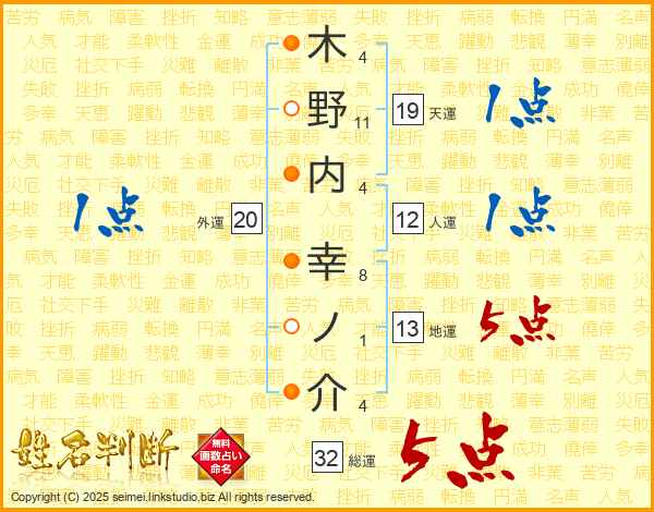 木(4画)野(11画)内(4画) 幸(8画)ノ(1画)介(4画)