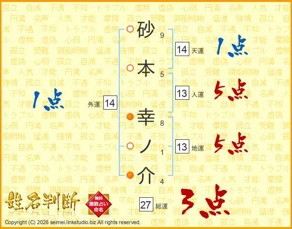 砂(9画)本(5画) 幸(8画)ノ(1画)介(4画)