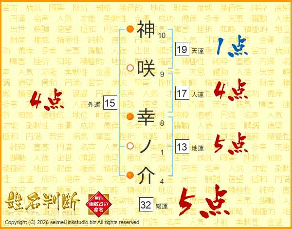 神(10画)咲(9画) 幸(8画)ノ(1画)介(4画)