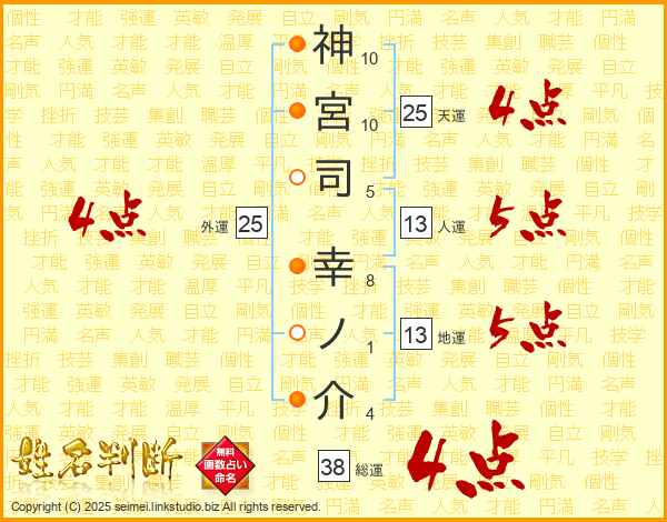 神(10画)宮(10画)司(5画) 幸(8画)ノ(1画)介(4画)