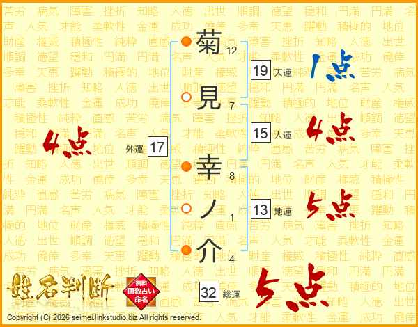 菊(12画)見(7画) 幸(8画)ノ(1画)介(4画)