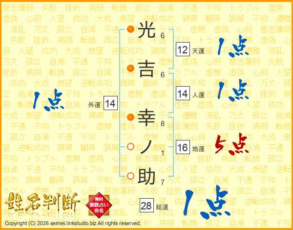 光(6画)吉(6画) 幸(8画)ノ(1画)助(7画)