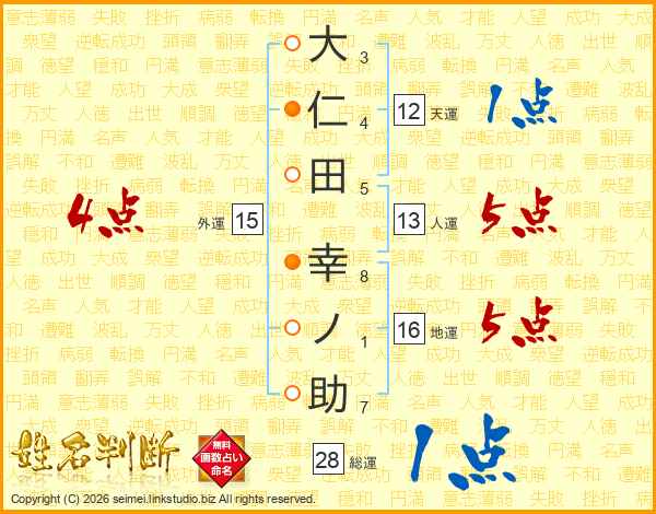 大(3画)仁(4画)田(5画) 幸(8画)ノ(1画)助(7画)