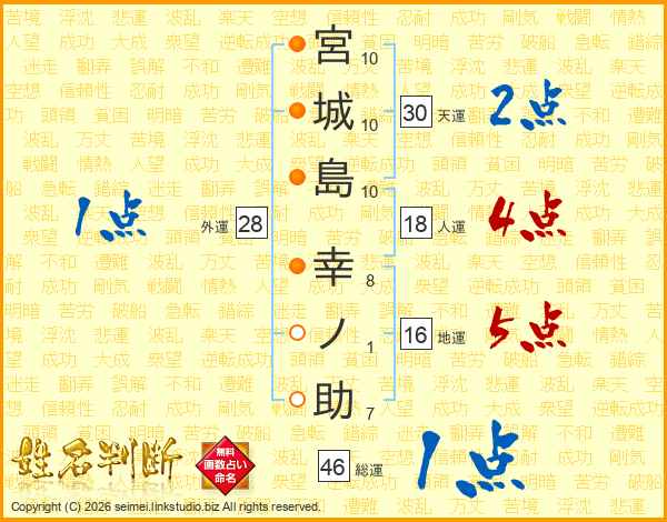 宮(10画)城(10画)島(10画) 幸(8画)ノ(1画)助(7画)