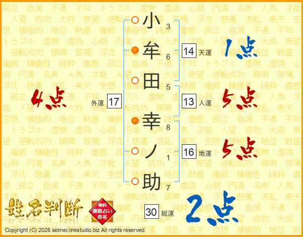 小(3画)牟(6画)田(5画) 幸(8画)ノ(1画)助(7画)