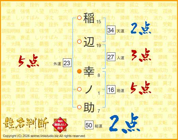 稲(15画)辺(19画) 幸(8画)ノ(1画)助(7画)
