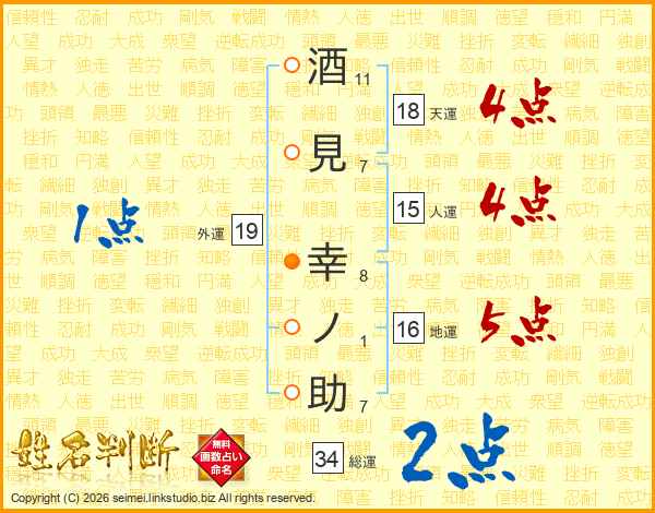 酒(11画)見(7画) 幸(8画)ノ(1画)助(7画)