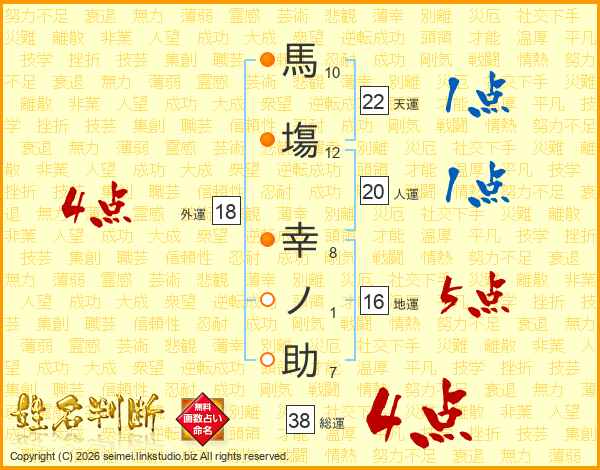 馬(10画)塲(12画) 幸(8画)ノ(1画)助(7画)