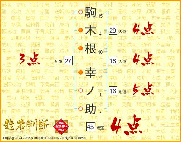 駒(15画)木(4画)根(10画) 幸(8画)ノ(1画)助(7画)