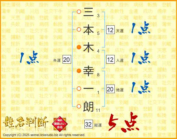 三(3画)本(5画)木(4画) 幸(8画)一(1画)朗(11画)