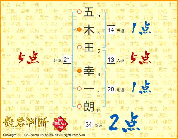 五(5画)木(4画)田(5画) 幸(8画)一(1画)朗(11画)