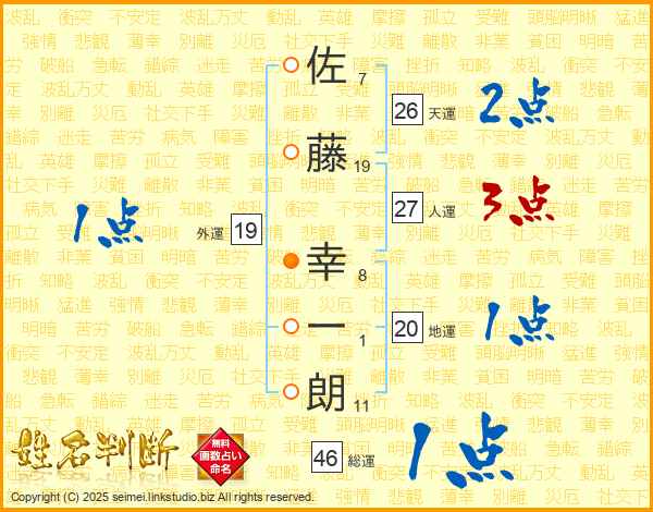 佐(7画)藤(19画) 幸(8画)一(1画)朗(11画)