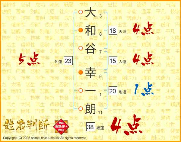 大(3画)和(8画)谷(7画) 幸(8画)一(1画)朗(11画)