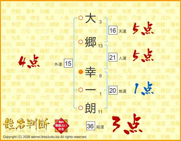 大(3画)郷(13画) 幸(8画)一(1画)朗(11画)